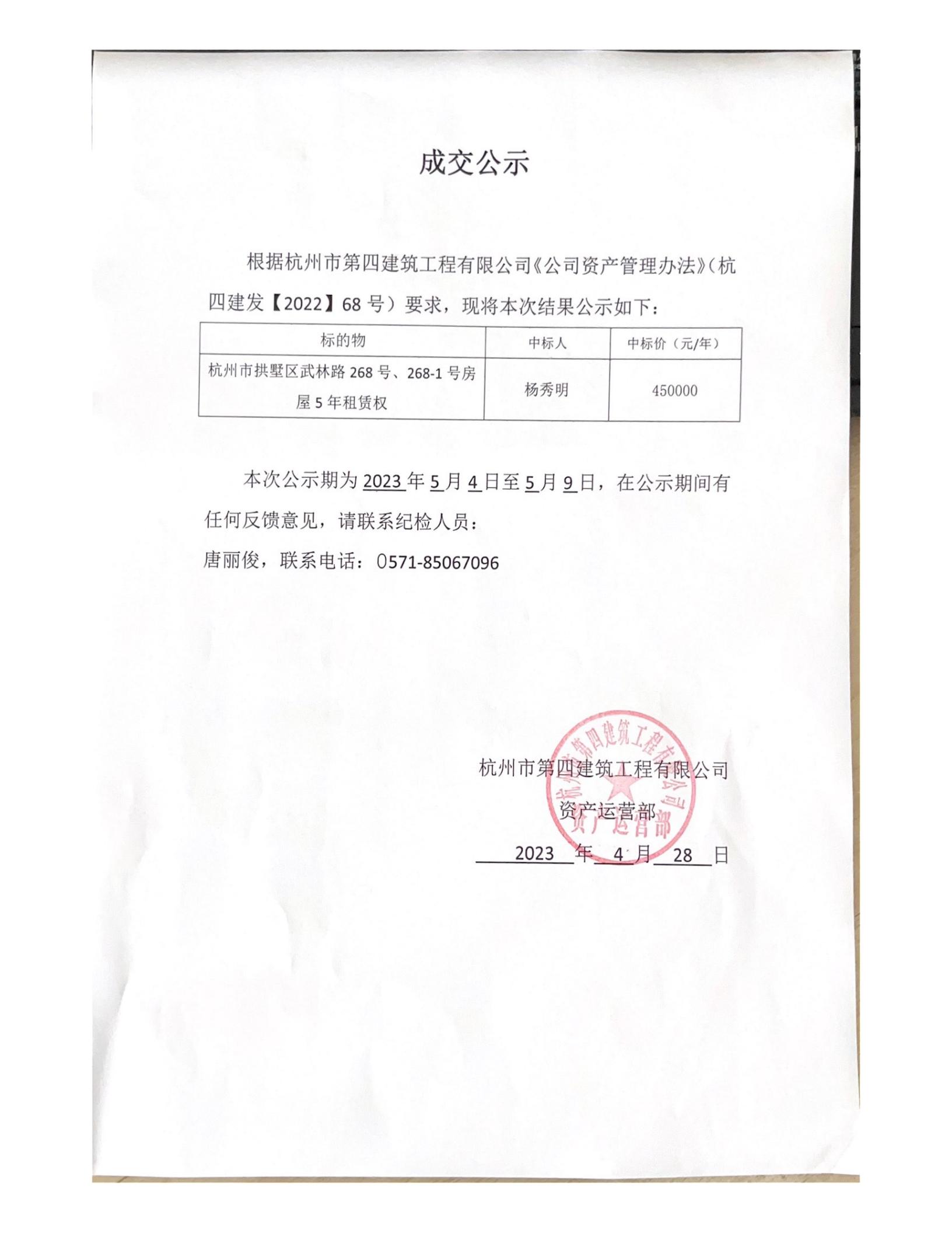 分享 微信分享 × 微信里点“发现”,扫一下 二维码便可将本文分享至朋友圈。 安博网页版武林路268号、268-1号成交公示 上一篇 安博网页版报废物资资产处置中标公示 下一篇 安博网页版数智化管控平台项目中标公示